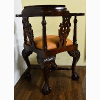 ・商品について 高級マホガニー材使用のチッペンデール様式のコーナーチェアです。 背もたれやアームの素晴らしいカーブが自慢です。足もどっしりと格調高く、座りやすい お椅子です。