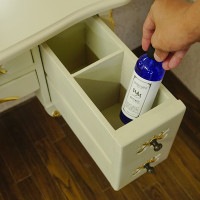 90cmとコンパクトなサイズですが、右側の引き出しのは18cmの長い瓶もラクラク収納!中央で仕切られているので、2箇所も使えます。中央部分にはアクセサリー、左側にはナイトクリームなどの低い容器にお勧めです。また、ミラーを外せば、デスクとしても使えます。